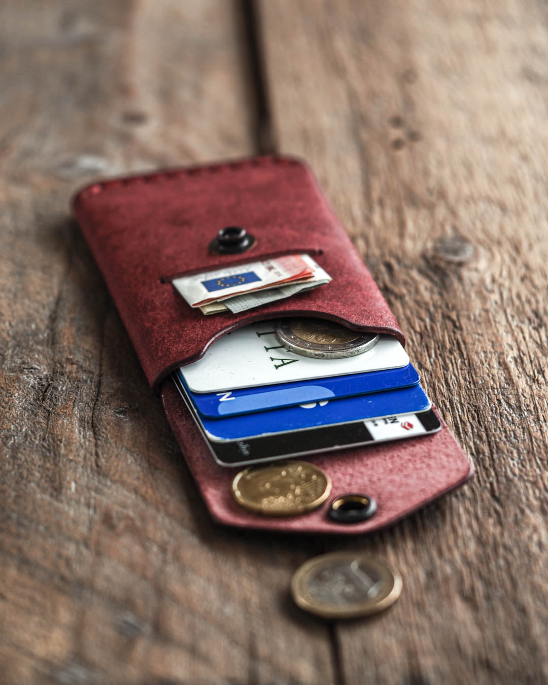 Suomessa käsintehty kompakti nahkalompakko, johon mahtuu 7 korttia – tai 5, jos käytät kolikoita. Päätaskun edessä on viilto taitetuille seteleille. Takakaskuun mahtuu käytetyin korttisi.